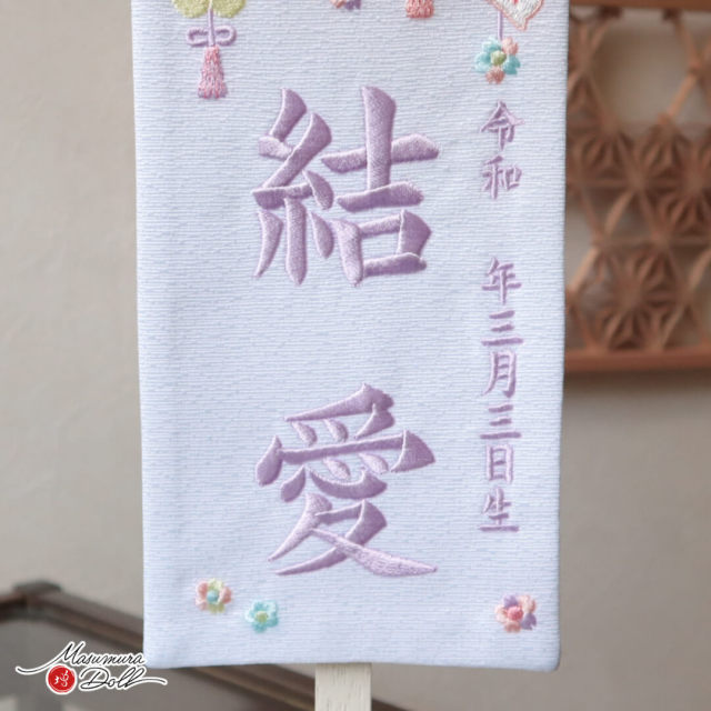 名前旗 女の子 かわいい 雛人形 名前旗 おしゃれ 刺繍 ジャガード刺繍名前旗 特小 吊るし飾り刺繍 ピンクブラウン パープル 白塗スタンド dou 増村人形店 MMN0310