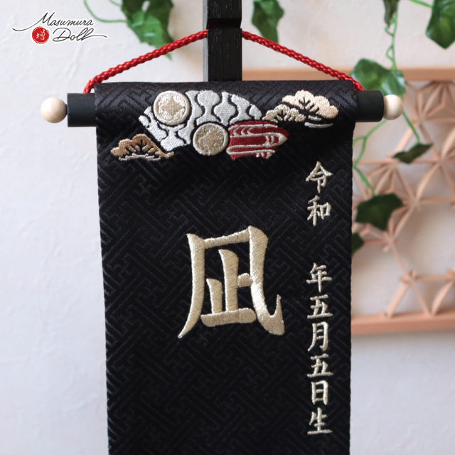 名前旗 男の子 かっこいい かわいい 五月人形 名前旗 おしゃれ 刺繍 ジャガード刺繍名前旗 特小 吉祥柄 招福小槌 黒 黒塗スタンド dou 増村人形店 MMN0310