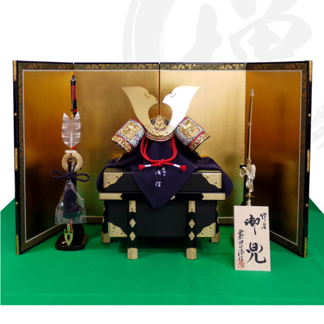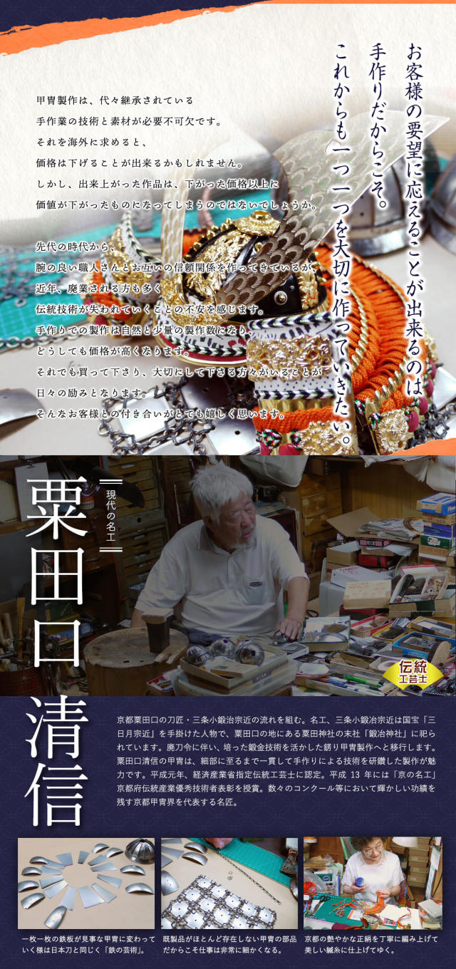 京都粟田口の刀匠・三条小鍛治宗近の流れを組む。名工、三条小鍛冶宗近は国宝「三日月宗近」を手掛けた人物で、粟田口の地にある粟田神社の末社「鍛冶神社」に祀られています。廃刀令に伴い、培った鍛金技術を活かした錺ち甲冑製作へと移行します。粟田口清信の甲冑は、細部に至るまで一貫して手作りによる技術を研鑽した製作が魅力です。平成元年、経済産業省指定伝統工芸士に認定。平成13年には「京の名工」京都府伝統産業優秀技術者表彰を授賞。数々のコンクール等において輝かしい功績を残す京都甲冑界を代表する名匠。