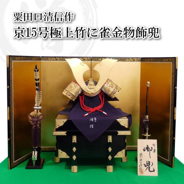 京都粟田口の刀匠・三条小鍛治宗近の流れを組む。名工、三条小鍛冶宗近は国宝「三日月宗近」を手掛けた人物で、粟田口の地にある粟田神社の末社「鍛冶神社」に祀られています。廃刀令に伴い、培った鍛金技術を活かした錺ち甲冑製作へと移行します。粟田口清信の甲冑は、細部に至るまで一貫して手作りによる技術を研鑽した製作が魅力です。平成元年、経済産業省指定伝統工芸士に認定。平成13年には「京の名工」京都府伝統産業優秀技術者表彰を授賞。数々のコンクール等において輝かしい功績を残す京都甲冑界を代表する名匠。