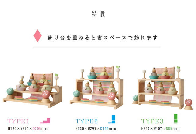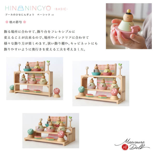 親しみ易く、楽しく手軽に飾れる積み木のような温もりのある木製のおひなさまです。一緒に飾れるようになったお子様の成長の喜びを感じてください。