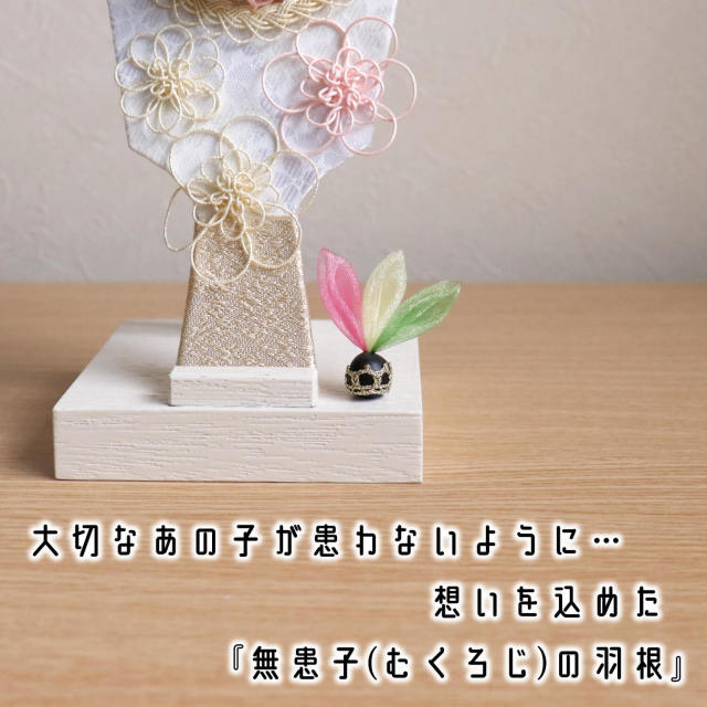 大切なお子様が患わないように。と願いを込めてムクロジという大木の種子につまみ細工の羽根があしらわれております。