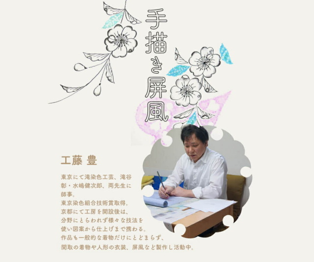 京都にて工房を開設後は、分野にとらわれず様々な技法を使い図案から仕上げまで携わる。作品も一般的な着物だけにとどまらず、関取の着物や人形の衣装、屏風など製作し活動中。