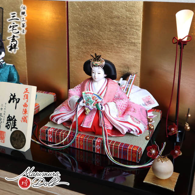 増村人形店では、現在では変色していまっている京都御所の正式な繧繝縁の色彩を京都で250年以上続く金襴商「誉勘商店」に復元してもらい、それを基に昼御座を製作し、 親王台に採用しています。