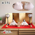 増村人形店では、現在では変色していまっている京都御所の正式な繧繝縁の色彩を京都で250年以上続く金襴商「誉勘商店」に復元してもらい、それを基に昼御座を製作し、 親王台に採用しています。