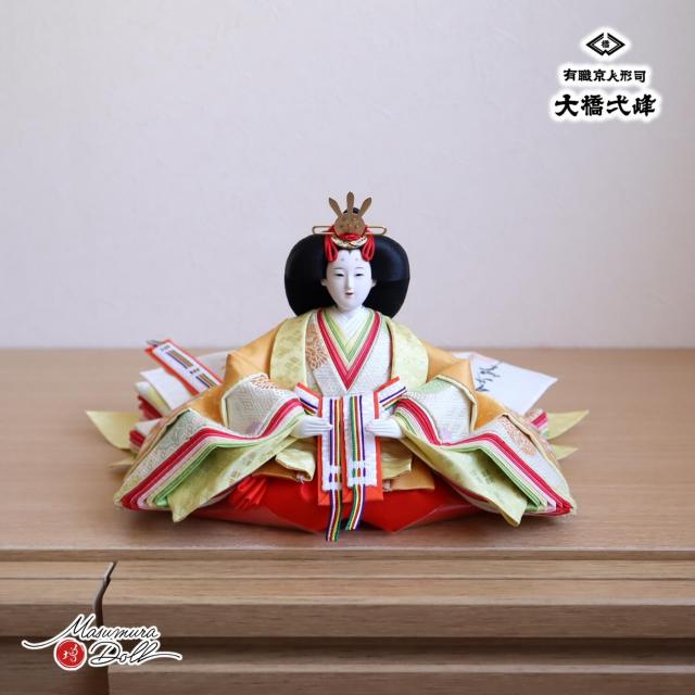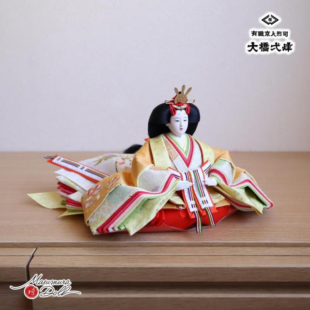 古典京雛の名匠、初代大橋弌峰を父にもつ二代目。京都鱗形屋九代目中村太兵衛氏に師事した初代は、60余年にわたって京人形にこだわり 磨き抜かれた技を二代目大橋弌峰へと見事に継承した。