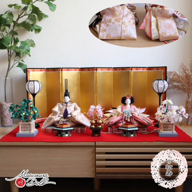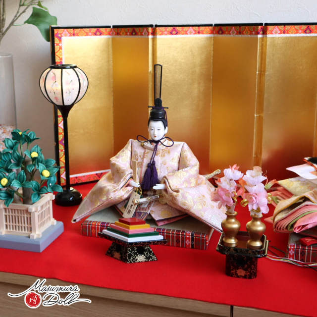 増村人形店では、現在では変色していまっている京都御所の正式な繧繝縁の色彩を京都で250年以上続く金襴商「誉勘商店」に復元してもらい、それを基に昼御座を製作し、 親王台に採用しています。