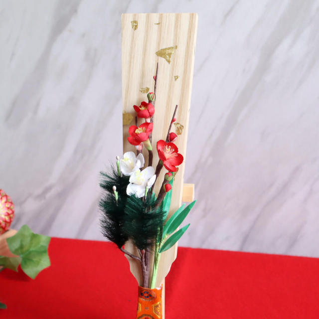 本品はお正月用に羽子板に松竹梅を飾り島台に見立てました。
