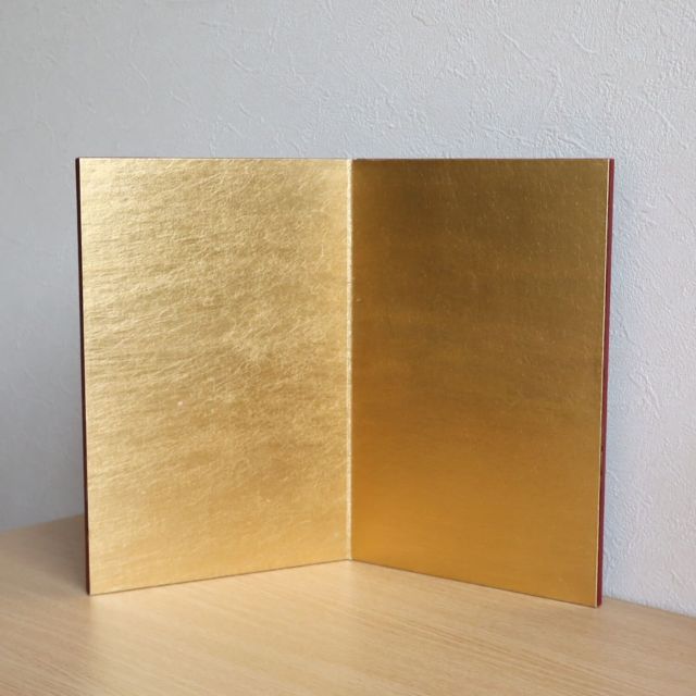 蝶番や屏風枠を付けずに金を引き立たせております。 また、不織布に箔押し加工をすることで縦や横に筋を出す風合いが楽しめる洋金箔屏風となっております。