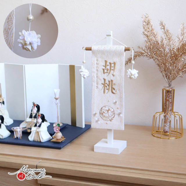 新作 ジャガード刺繍名前旗 生成マリ クリーム (ミニ) 国産白塗スタンド ちりめん つまみ 吊るし ひな人形 名まえ 刺繍 雛祭り 増村人形店 10002839