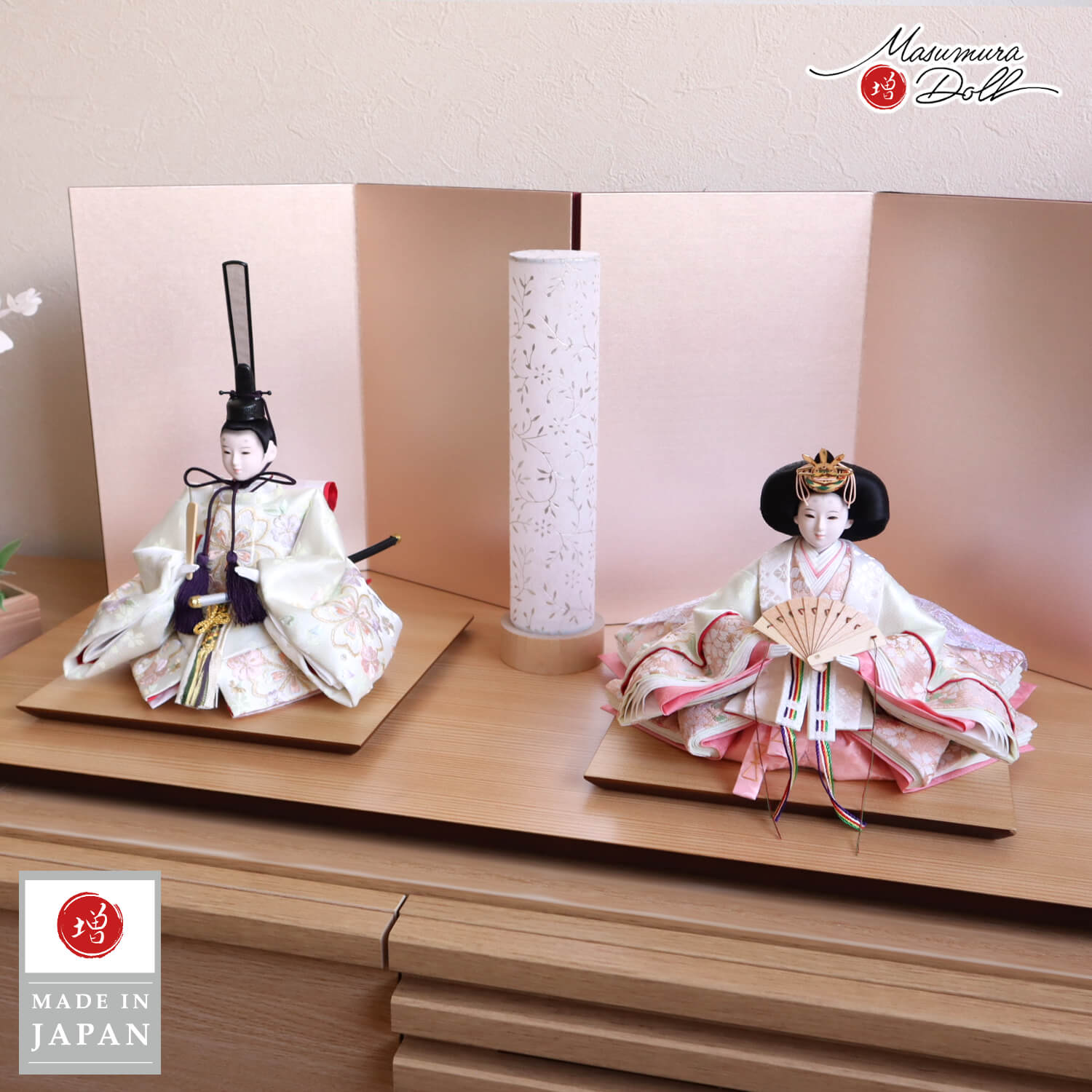雛人形 内閣総理大臣賞受賞作家 松宝作 25号 芥子 ホワイト 桜刺繍 無地扇 シルキーピンク裏箔屏風 唐草和紙あかりスタンド コードレス ナチュラル杉台 増村人形店 シンプル 10003074