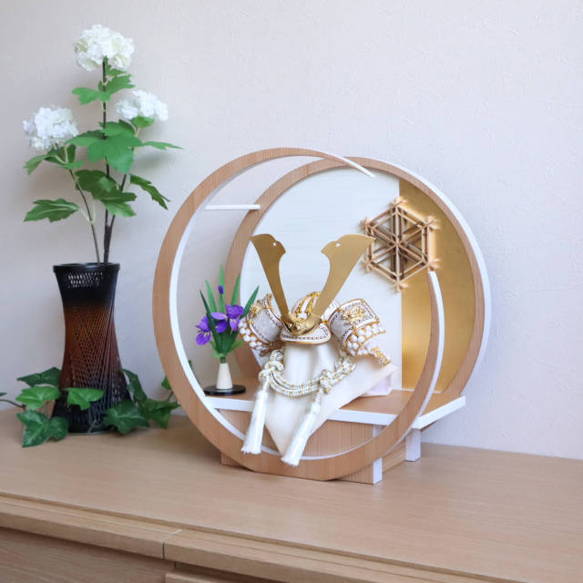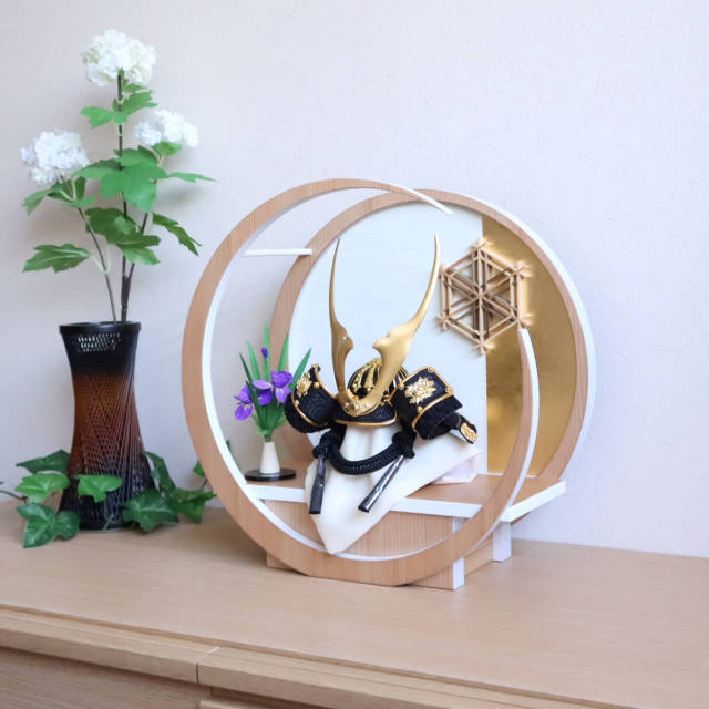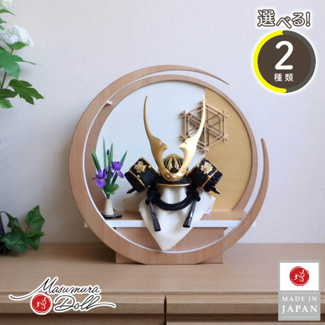 【選べる2種類】ゴールド&漆黒 貫前(ぬきさき) 本印伝革 兜 完全日本製 月-tsuki- 大川組子 アヤメ飾 円形ナチュラル杉 日本製 増村人形店 双子 今どき 人気 10003080