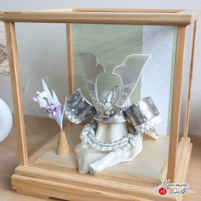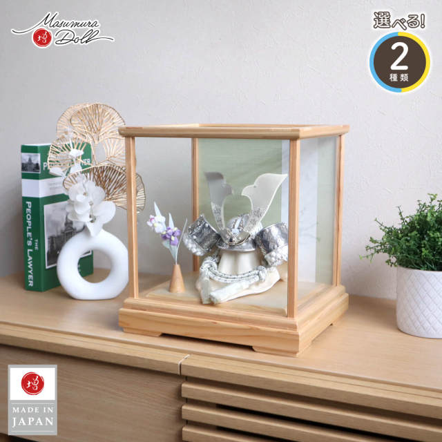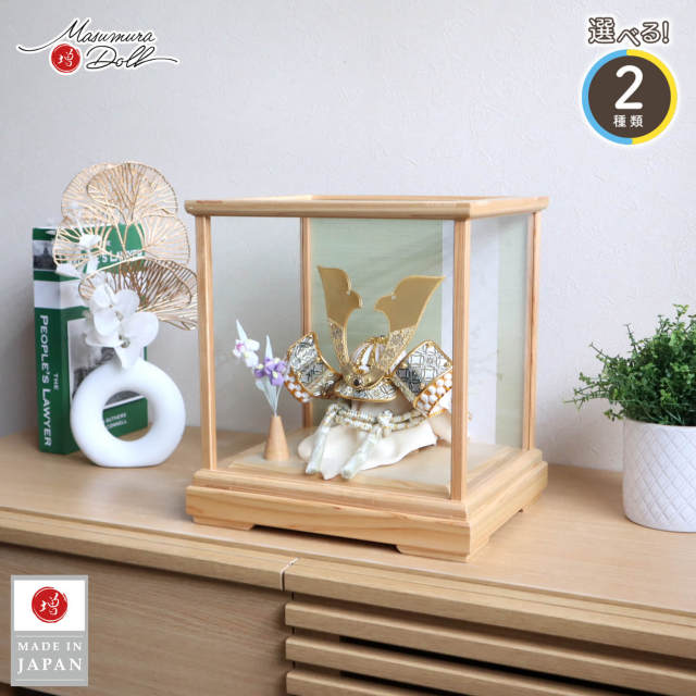 五月人形 ケース飾り 兜 【選べる2種類】彫金七宝兜 ゴールド&シルバー 共吹き返し兜 白鉢 国産ヒノキ枠 ガラスケース 淡緑色七宝和紙ライン ちりめん菖蒲飾り 双子 増村人形店 オリジナル コンパクト 10003082
