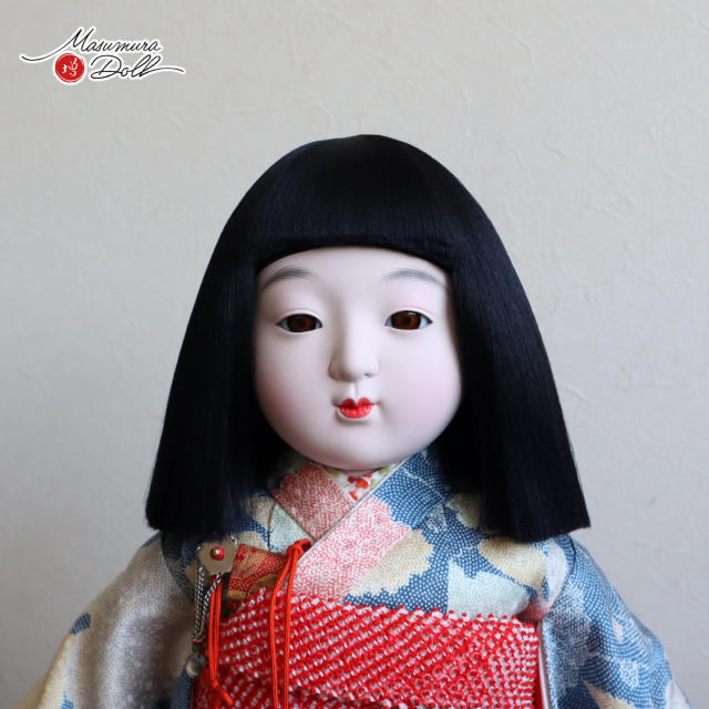 ※増村人形店の市松人形は、通常より可愛らしくみえるように、元賀章介の手で特別に髪の毛を短く作成して頂いております。
