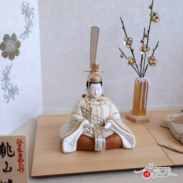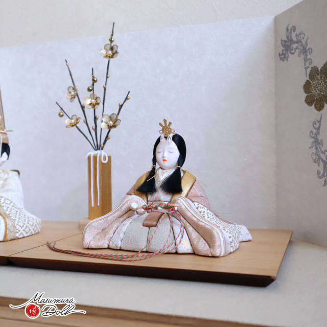 伝統工芸士 木村一秀作 甲州印伝 オリジナル 桃山雛 ラメ屏風「金銀花」立花 クリアフラワー ゴールド梅 セパレート ナチュラル杉製平台 ベージュ毛氈飾り 増村人形 ひな人形 雛人形 木目込み人形 10003296