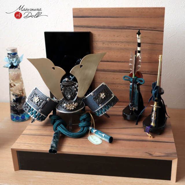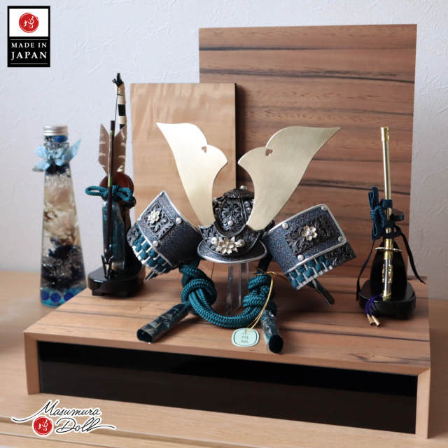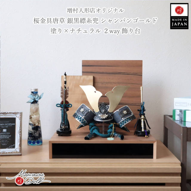 五月人形 コンパクト おしゃれ インテリア 兜飾り 5月人形 端午の節句 唐草桜金物 浅葱糸兜 シャンパンゴールド 銀小札 共吹返し 木製 衝立飾り キジ羽根 本藤巻弓太刀 増村人形店 10003345