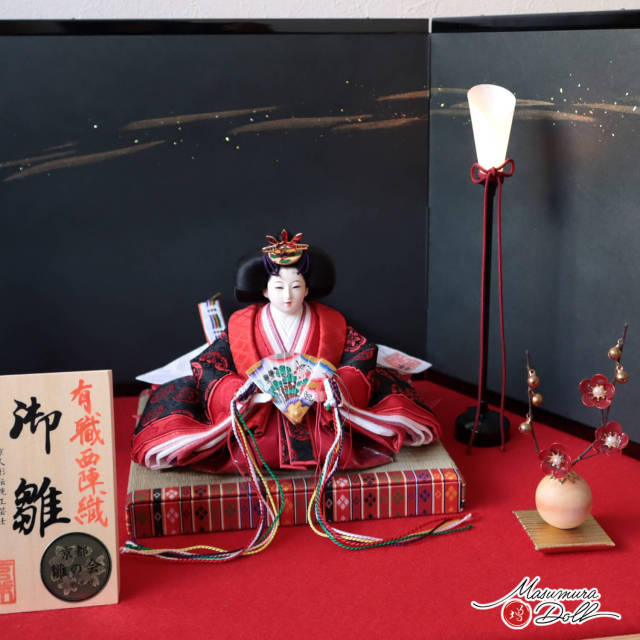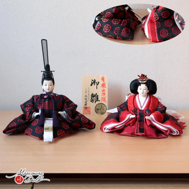 増村人形店では、現在では変色していまっている京都御所の正式な繧繝縁の色彩を京都で250年以上続く金襴商「誉勘商店」に復元してもらい、それを基に昼御座を製作し、 親王台に採用しています。