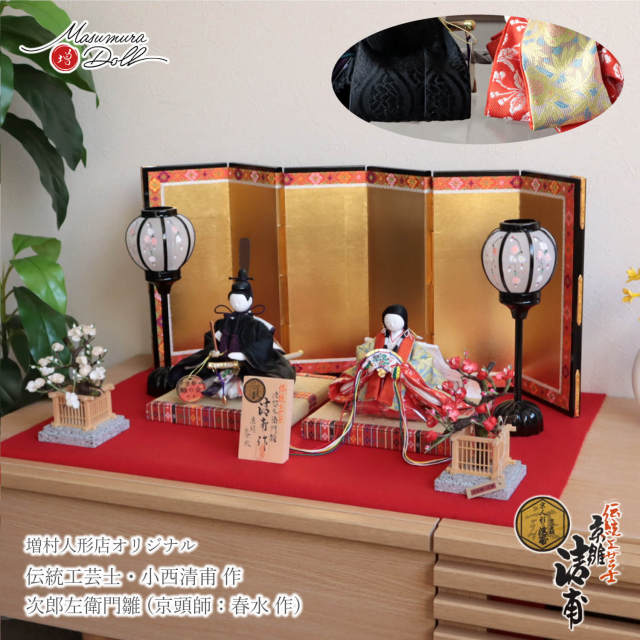 増村人形店では、現在では変色していまっている京都御所の正式な繧繝縁の色彩を京都で250年以上続く金襴商「誉勘商店」に復元してもらい、それを基に昼御座を製作し、 親王台に採用しています。