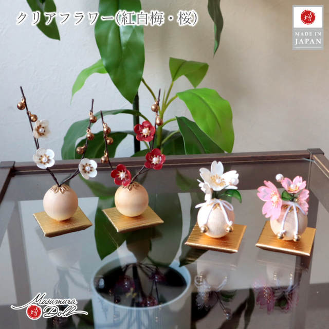 雛道具の本場静岡製の完全純国産手作り品!透明感のある透き通ったお花とナチュラルにこだわったころんと可愛い台。